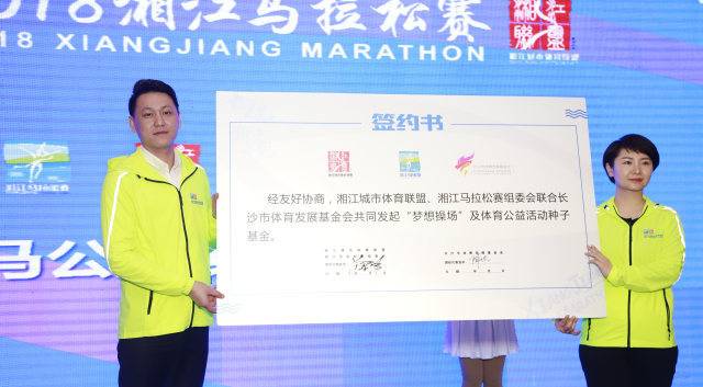 3月18日湘江马拉松赛新闻发布会现场,湘江城市体育联盟、湘江马拉松赛组委会联合长沙市体育发展基金会共同发起——“梦想操场”及体育公益活动种子基金。