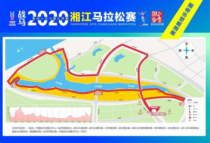 赛道全程(10km):(起点)中国动力谷展示中心—仙月环路往北—新马大道往西—新马北路往南—万丰路往西—滨江路往南—湘江沿河堤坝路往南—新丰路往东—滨江路往北—进入万丰湖湿地公园亲水步道往东—高塘路往西—仙月环路往南—中国动力谷展示中心(终点)