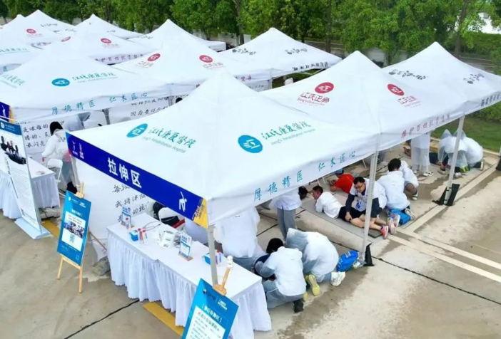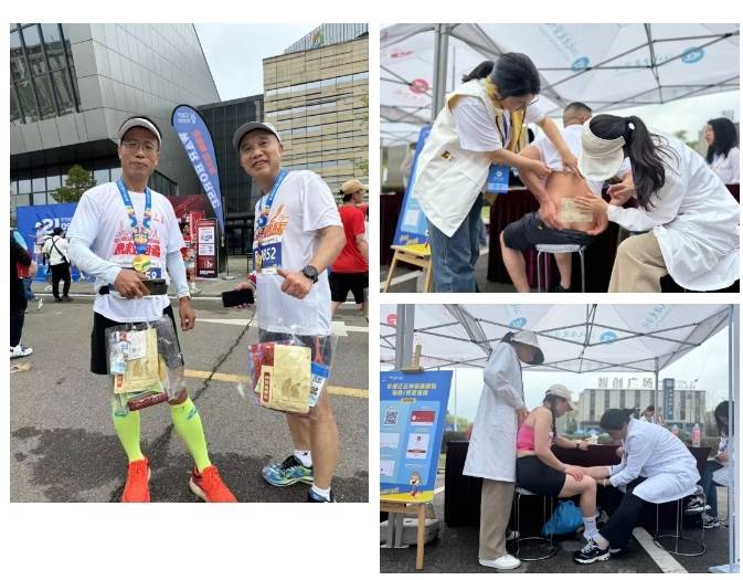 为更好服务选手,应对不同天气和不同的赛后情况,2024湘江马拉松特邀请社港江公江氏正骨团队在长沙站终点设置了赛后服务区,赛后服务区共分为引导区、拉伸区及敷贴消痛区。