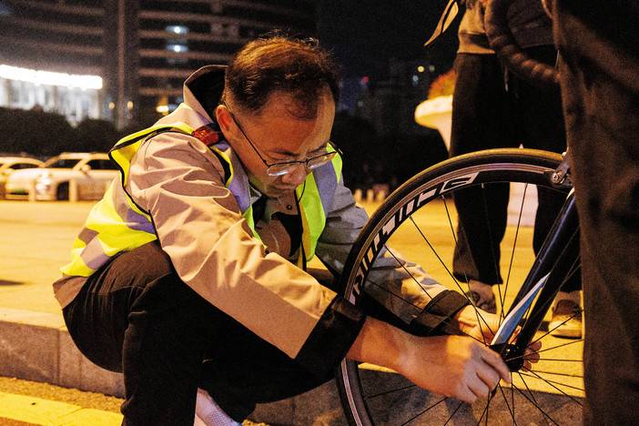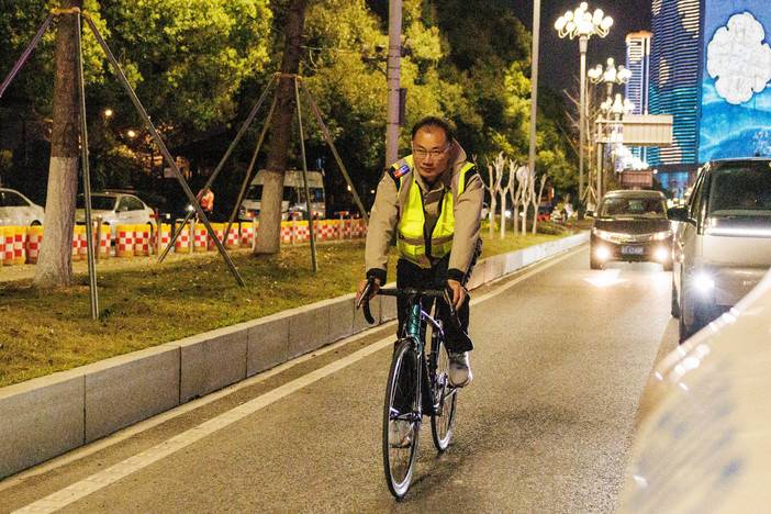 在对琼斯计数器完成校准后,江平老师骑上自行车,从起点贺龙体育场(南广场)出发。每当骑行到公里点、补给点和折返点的位置,江平老师都会停车,此时,湘马组委会工作人员会根据琼斯计数器显示数据,进行数据核对、定点标记位置描述并拍照存档,以便赛道路线和距离符合认证标准,科学合理地设置补给站和医疗点,为参赛选手提供更优质的服务。