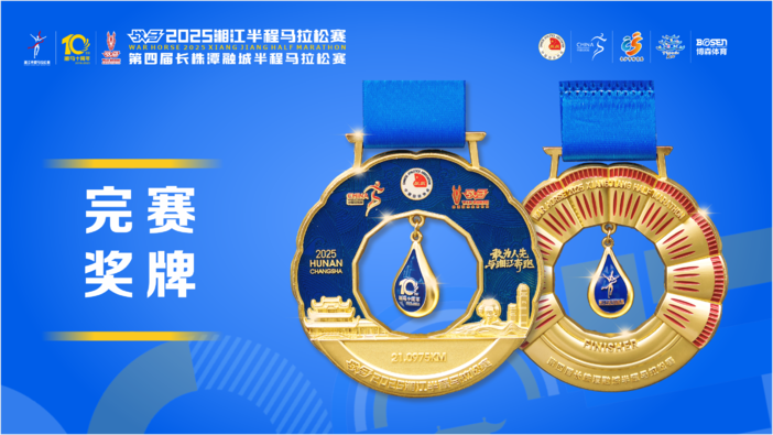 本届赛事奖牌以“湘水不息·奔涌十年”为核心理念,奖牌正面由长沙城市地标建筑贯穿,上方是浮雕的水纹,勾勒“江水映城”的深邃意境,底部水波纹托举赛事名称;奖牌背面外围十道起伏波纹呼应贺龙体育场的轮廓,铭刻十年赛事历程;奖牌中央灵动的水滴设计将母亲河的滋养、城市文脉与跑者荣耀凝练为方寸间的永恒纪念。