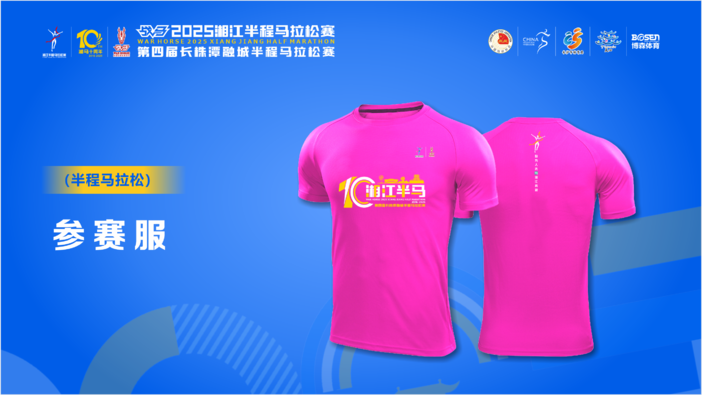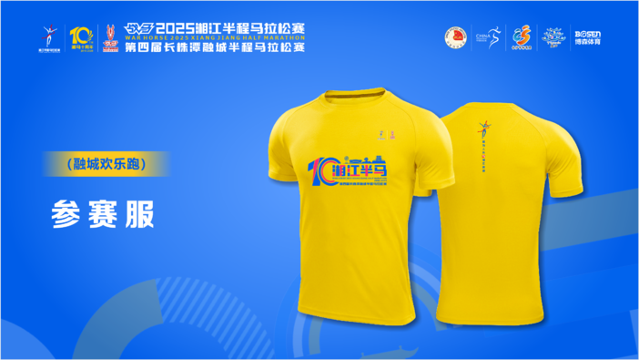 本届赛事为半程马拉松、融城欢乐跑的选手分别定制了红、黄两色参赛服。服装正面代表“十年湘马”的数字“10”结合抽象跑道线条设计,贺龙体育场、橘子洲头、杜甫江阁等长沙新老地标遥相辉映,展示了长沙的历史底蕴与现代活力,参赛服背面印有赛事的主题口号“敢为人先,与湘江奔跑”,承载湘江奔腾不息的运动精神,诚邀全世界跑友来感受长沙的无限魅力。